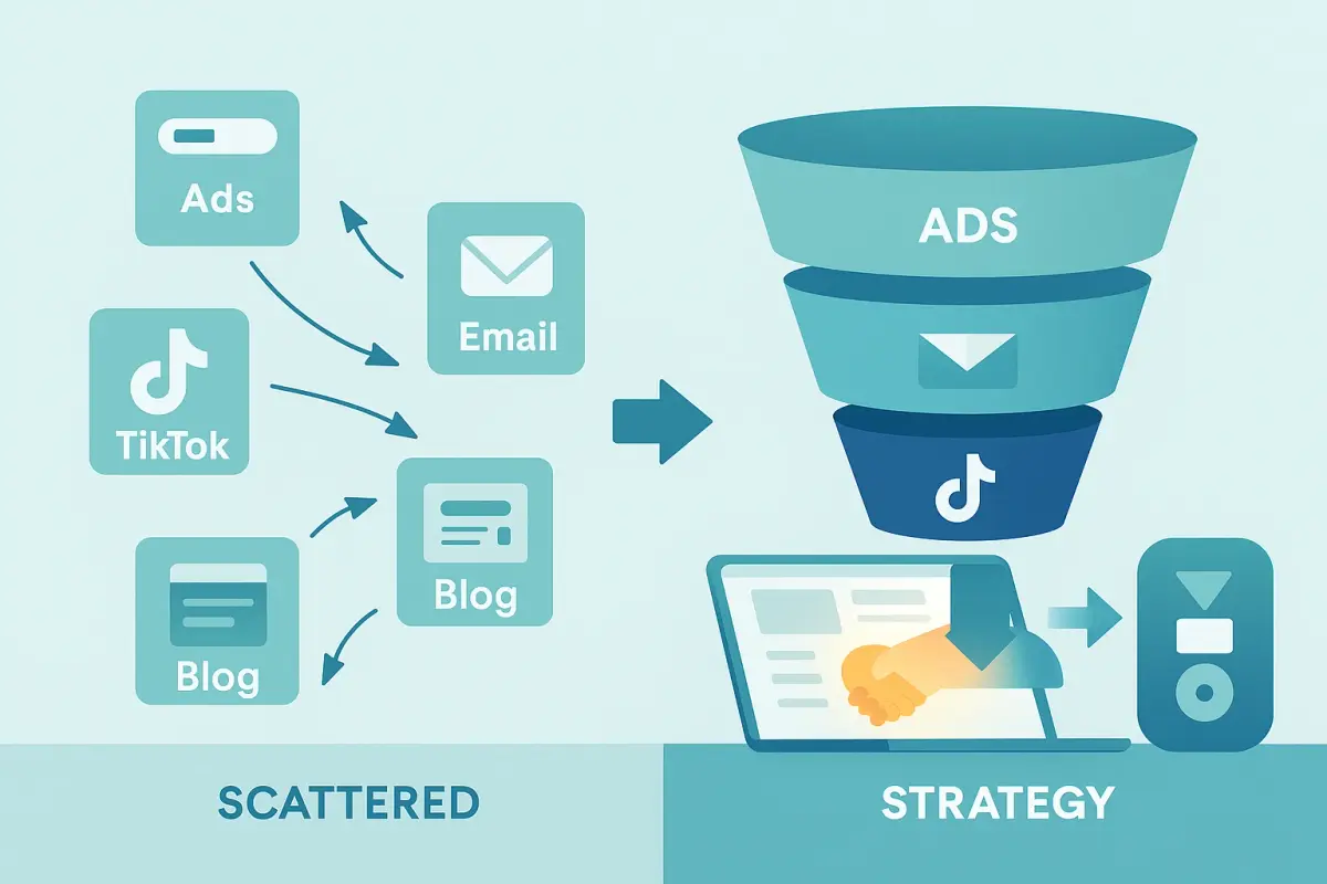 The belief: 'If we do ads, emails, TikTok, and blogs all at once, we'll win.' The risk is fragmentation: mismatched tone, scattered budgets, and no clear funnel. The fix is strategy first: Who's the audience? Where are they? What do they need? Only then do tactics align into coordinated plays instead of noise.
