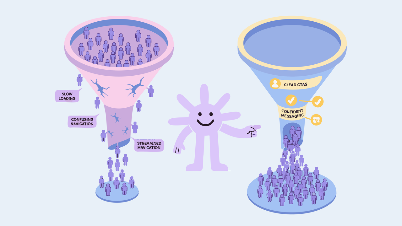 Think of your website as a funnel. Visitors come in at the top, but too many exit before taking action. These leaks often come from: • Pages that load slowly or confuse users • Navigation that buries important content • Unclear paths to the next step in the journey. Our web design process includes funnel mapping to identify drop-off points, heatmap testing to analyze user behavior, and UX fixes that keep people moving toward conversion.